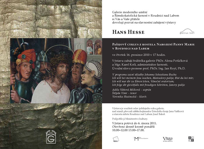 Galerie moderního umění v Roudnici nad Labem si Vás dovoluje pozvat na zahájení výstavy HANS HESSE - PAŠIJOVÝ CYKLUS Z KOSTELA NAROZENÍ PANNY MARIE V ROUDNICI NAD LABEM které se bude konat ve čtvrtek 16. prosince 2010 od 17 hodin. Výstavu zahájí ředitelka galerie PhDr. Alena Potůčková a Mgr. Karel Kočí, administrátor farnosti. Úvodní slovo pronese prof. PhDr. Ing. Jan Royt, Ph.D. V programu zazní skladby J. S. Bacha v podání Adély Váňové Mičkové - soprán, Štěpána Vimra - tenor a Veroniky Husinecké - klavír.