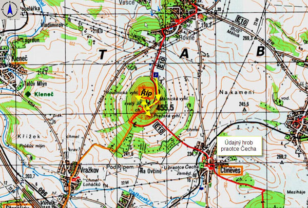 Délka výletu: 100 m – 3 000 m Mapa výletu:   Obr. 1- kostel sv. Matouše ve Ctiněvsi- pohled od východu Naše pátrání začíná ve starých kronikách a letopisech. O příchodu Čechů na Říp se dozvíme již v Kosmově kronice- nejstarší české, latinsky psané kronice, v Dalimilově kronice- nejstarší české, česky psané kronice, v kronice Přibíka Pulkavy z Radenína, v kronice Václava Hájka z Libočan, ve Starých pověstech Českých od Aloise Jiráska- všichni tito autoři příchod Čechů na Říp popisují. Hledejme tedy zmínky o hrobu praotce Čecha. Václav Hájek z Libočan uvádí rok 661 jako rok pohřbu praotce Čecha. Navíc píše, že místo vzniklé kolem hrobu zanedlouho pojmenováno bylo Ctiňoves“ pro poctivost toho hrobu“. Obr. 2- Hájkova Kronika Česká, která je vystavena např. v Jandově muzeu v Budyni n. O. ukrývá i tento obrázek zobrazující údajný Čechův pohřeb ve Ctiněvsi. My se přidržíme nejčastěji vyslovované pověsti o umístění hrobu praotce a počkáme do západu slunce. Při západu slunce totiž ukazuje stín kostelní věže na místo, kde byl praotec Čech údajně pochován. Pokud nechceme čekat do západu slunce vydáme se východně od kostelíka za hřbitovní zeď a nalezneme zde až k fotbalovému hřišti jen úplně rovné, pečlivě zorané pole. Zde má být podle mnoha literárních pramenů praotec Čech nejspíše pochován.